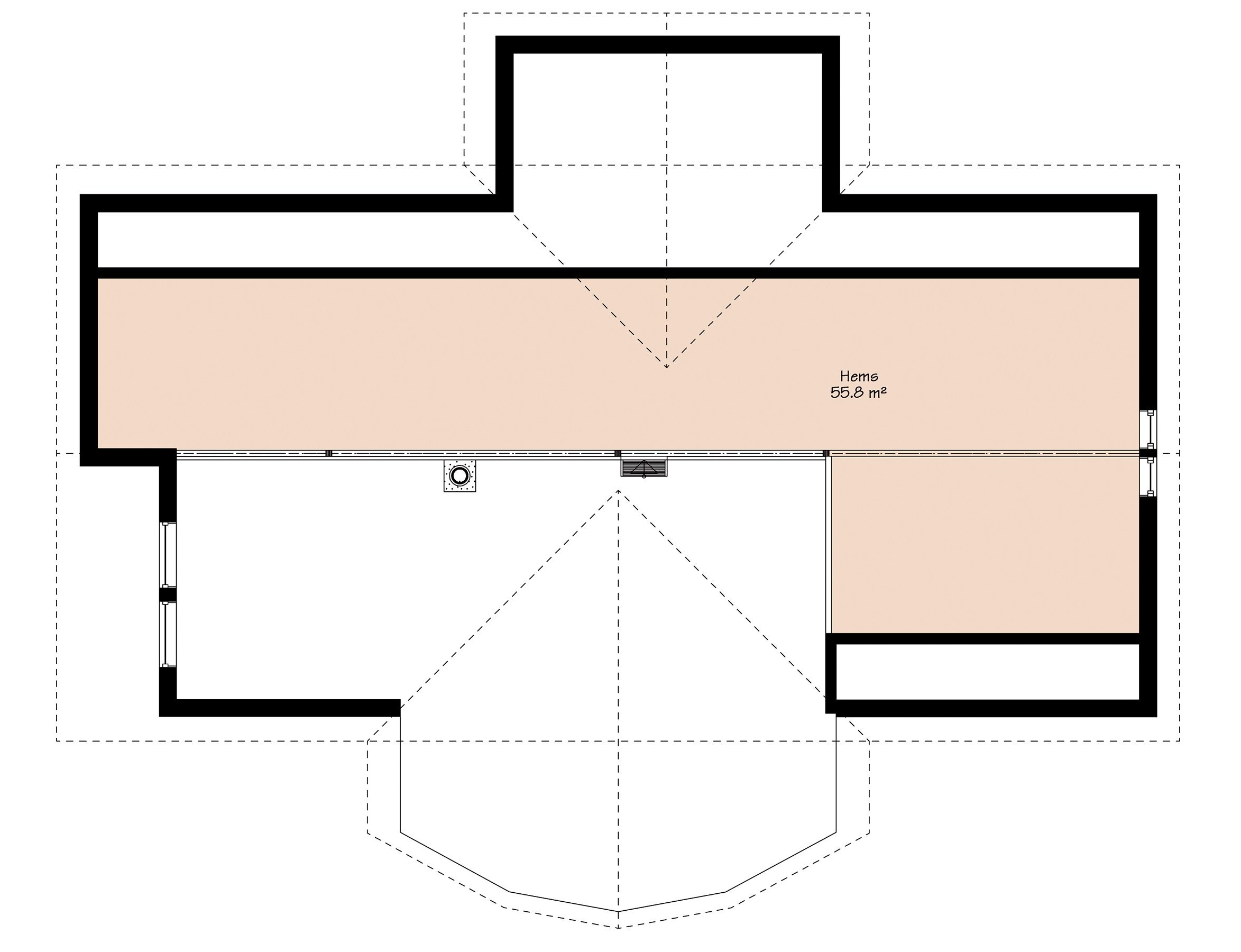 Dette er en hytte med ekstraordinær fasade. De store vinduene i front gjør at man får mye lys inn i sturen og en mulighet for å få en utsikt utenom det vanlige. Hemsen på hytten er også ekstra stor. Her er det muligheter for bod eller lekeplass.