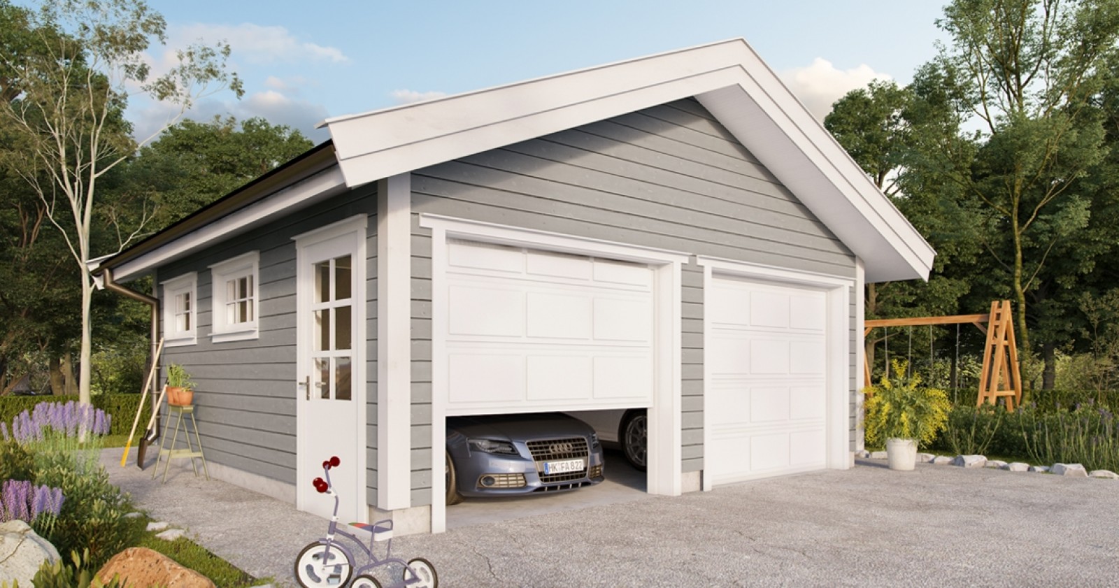 Om familien disponerer mer enn en bil, er det svært praktisk med dobbel garasje. En dør med smårute-vindu er plassert på vestsiden av garasjen for enkel tilgang uten å måtte åpne garasjeprotene. Vinduer er satt inn på både øst- og vestsiden av bygget for godt lysinnslipp og garasjen fremstår som klassisk og fin.