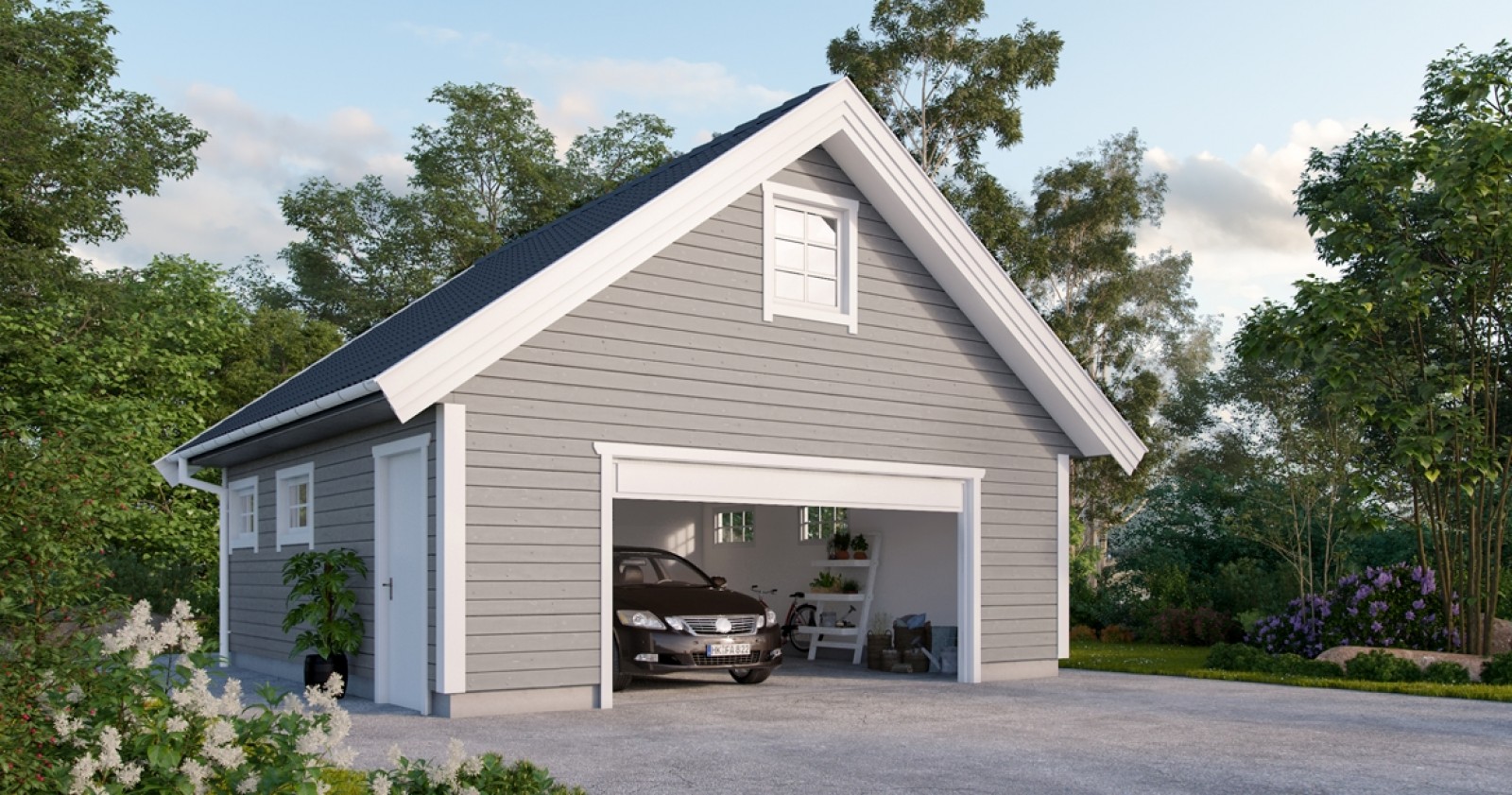 Garasje 809 er en enkel, men innholdsrik garasje med et garasjerom på 45m2. Her har du god plass til bil, sykler, sportsutstyr og andre ting du ønsker å oppbevare i garasjen. Vinduer på begge sider og i møner slipper godt med lys inn i garasjerommet, og en dør på garasjens østside lar deg gå inn og ut av garasjen uten å måtte åpne garasjeporten.